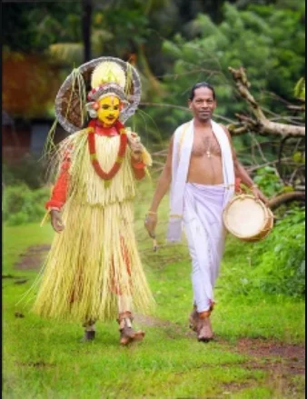 The Nalke community in Mangalore dresses up with a costume made of tender coconut leaves, colorful clothes, anklets, caps made of areca nut sheaths etc. Even the person does face paints with various colors and holds an umbrella made of leaves and dances in front of every house with the beats of the instrument tembare.