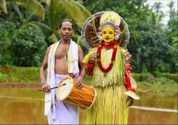The Nalke community in Mangalore dresses up with a costume made of tender coconut leaves, colorful clothes, anklets, caps made of areca nut sheaths etc. Even the person does face paints with various colors and holds an umbrella made of leaves and dances in front of every house with the beats of the instrument tembare.
